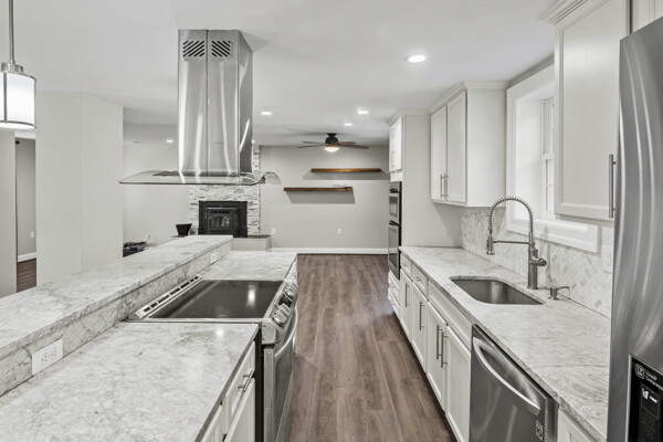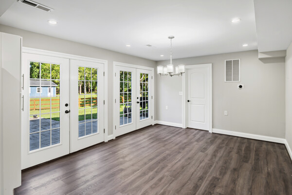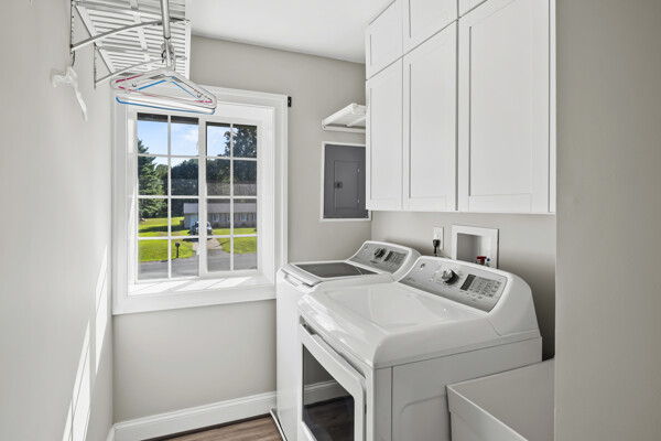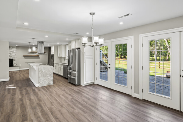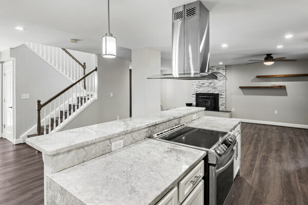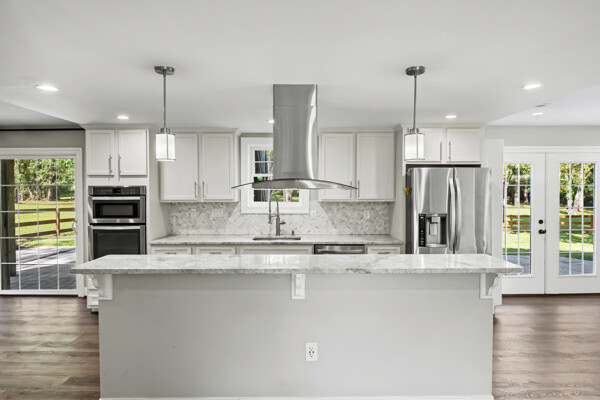 Inside, the open-concept kitchen shines with granite countertops, soft-close drawers, stainless steel appliances, and a built-in wall oven with microwave. The dining area walks right out to the patio—perfect for outdoor meals or cozy fall nights under the stars. A warm, inviting living room is anchored by a pellet stove that makes the whole space feel like home.