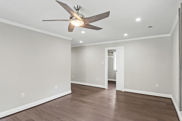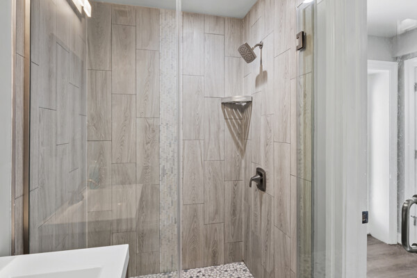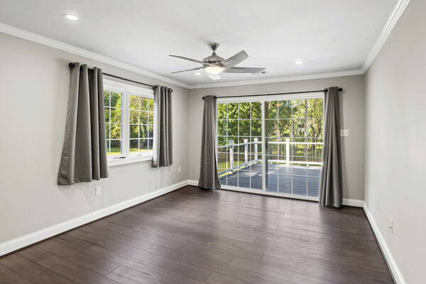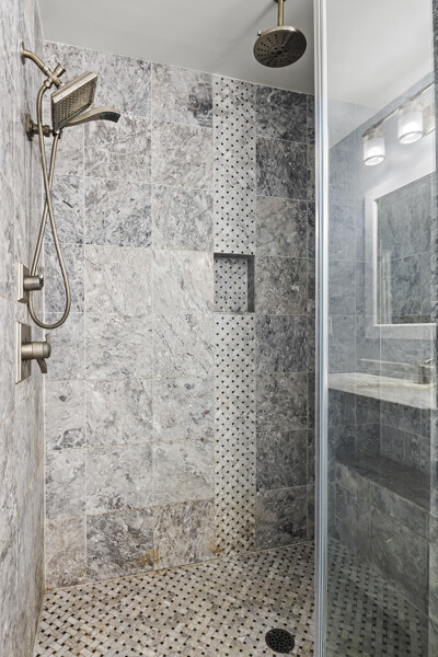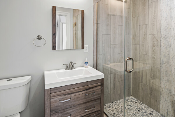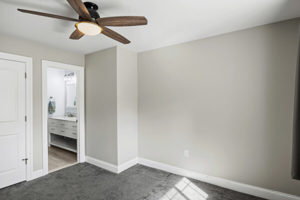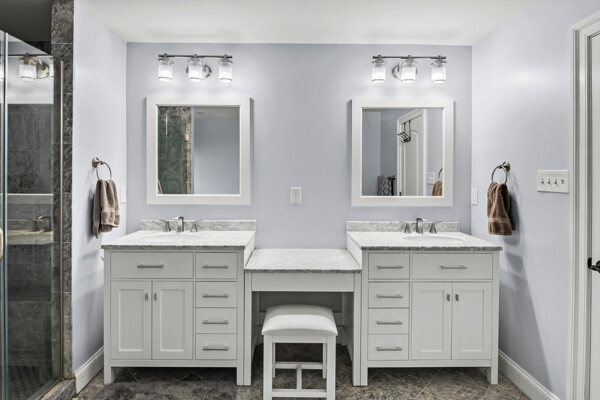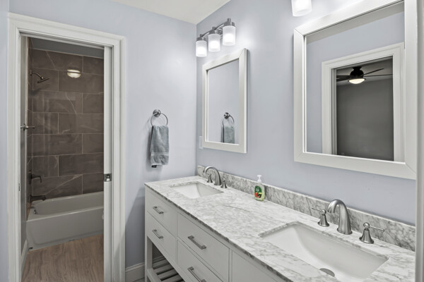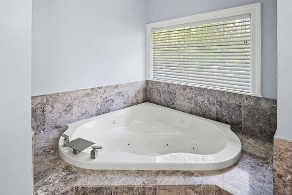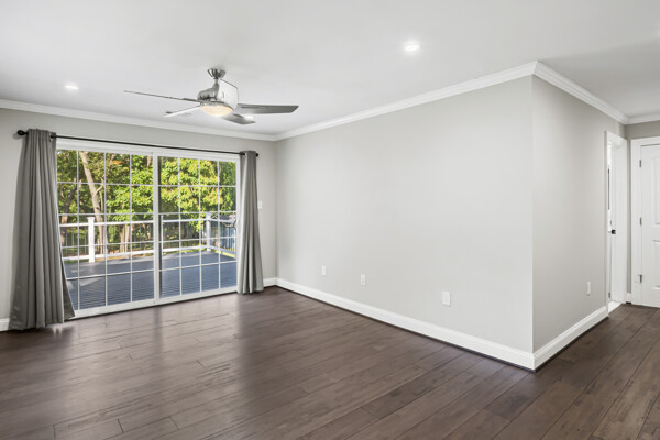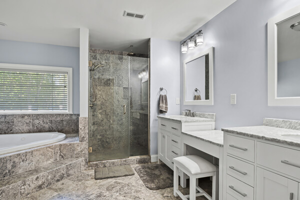 The main level offers a flexible bedroom/office, full bath with shower, and laundry room. Upstairs, the primary suite is a true retreat with sliding glass doors to a private deck plus a spa-inspired bath featuring double vanities, a soaking tub, and a dual-head shower. Two additional bedrooms share a hall bath with a double vanity sink.