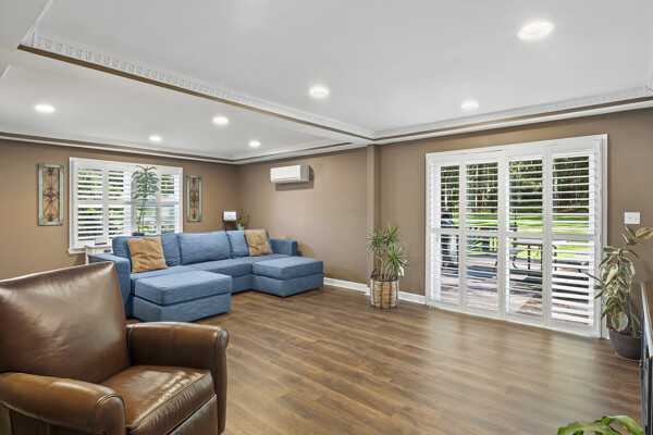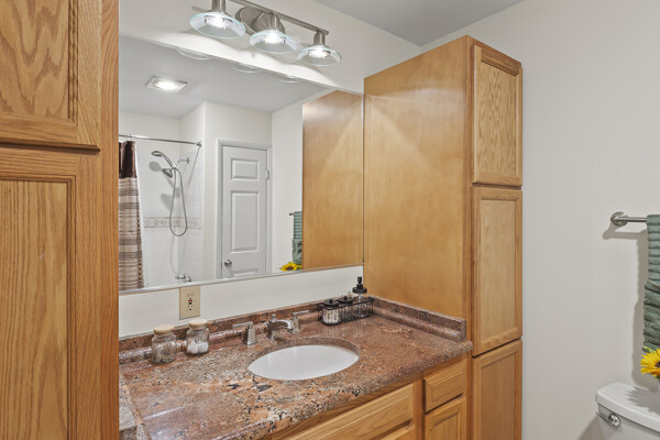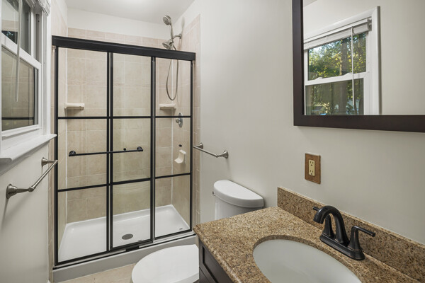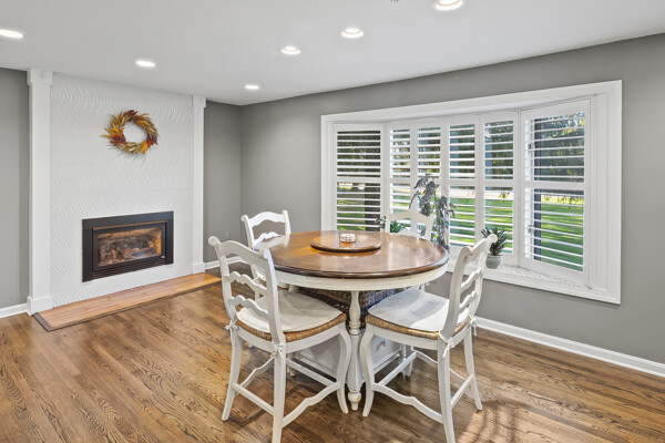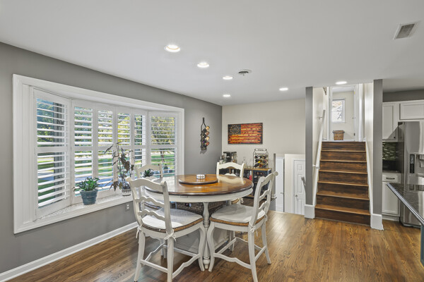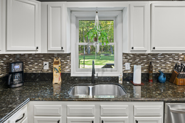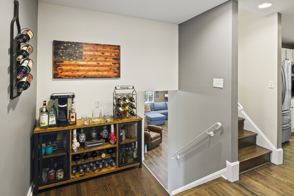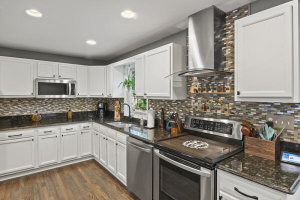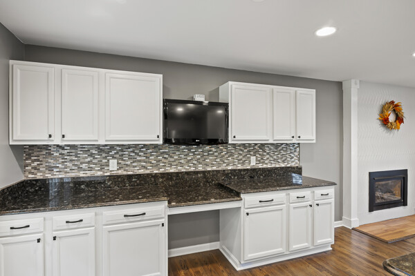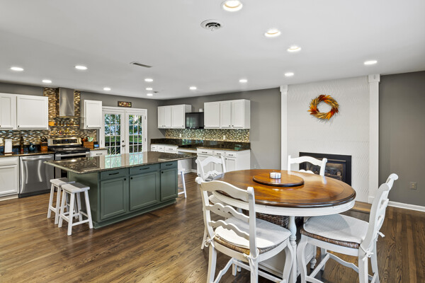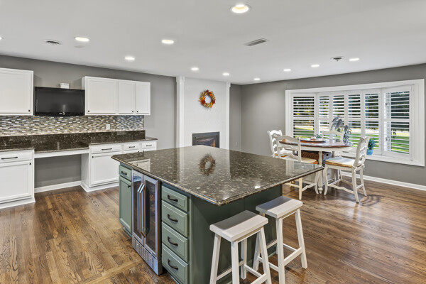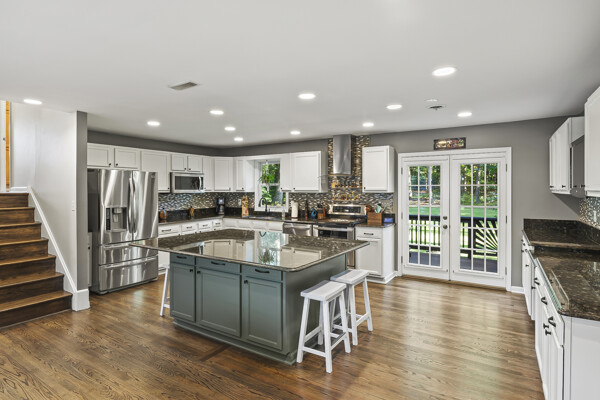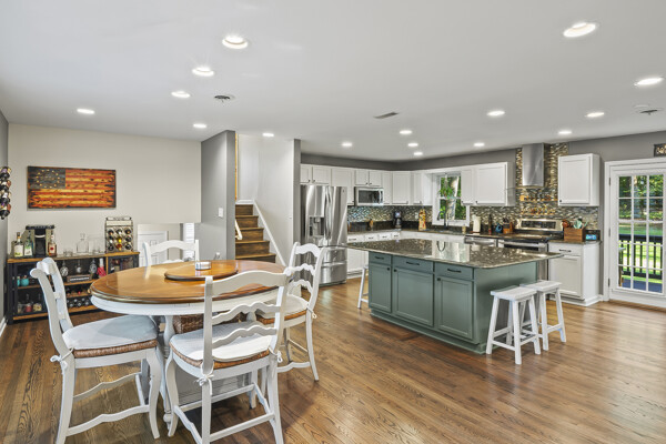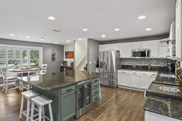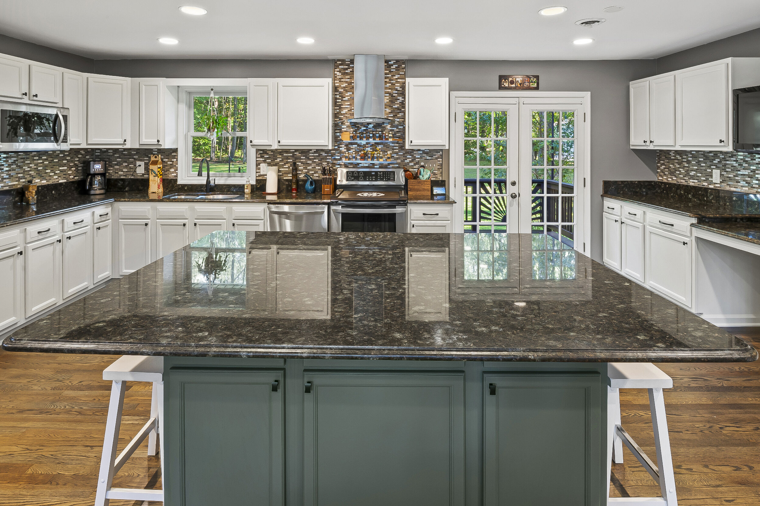 The highlight of the home is the amazing kitchen that spans the entire main level; about 42' x 24'. It features white cabinetry; granite countertops; a beautiful glass tile backsplash; and stainless-steel appliances. There’s a spacious dining area plus a huge center island that can seat four, with storage on all sides and a recessed beverage refrigerator. The kitchen flooring is wood; and a door leads to the upper deck; perfect for morning coffee or outdoor dining.