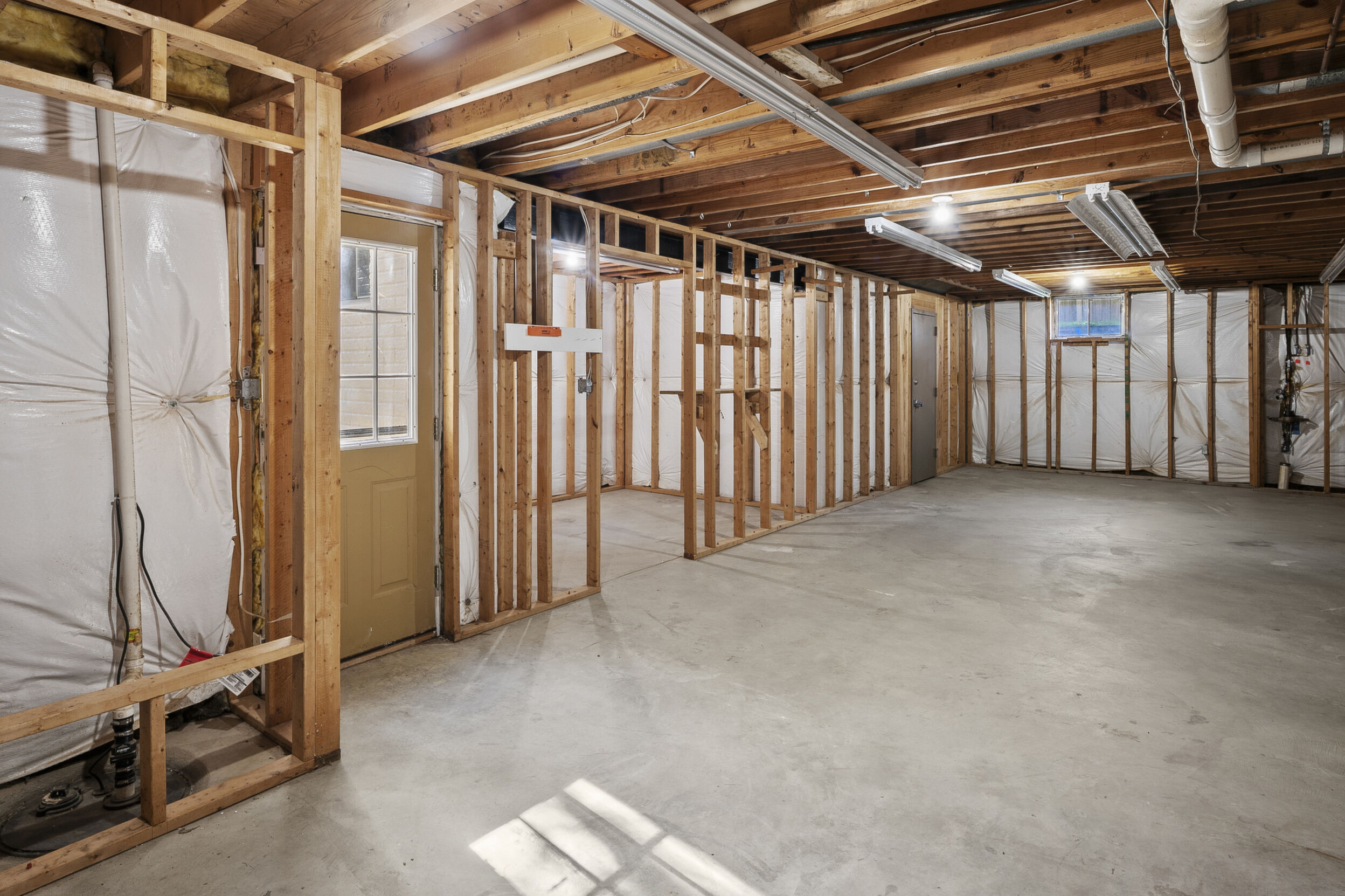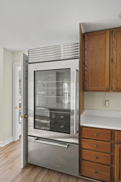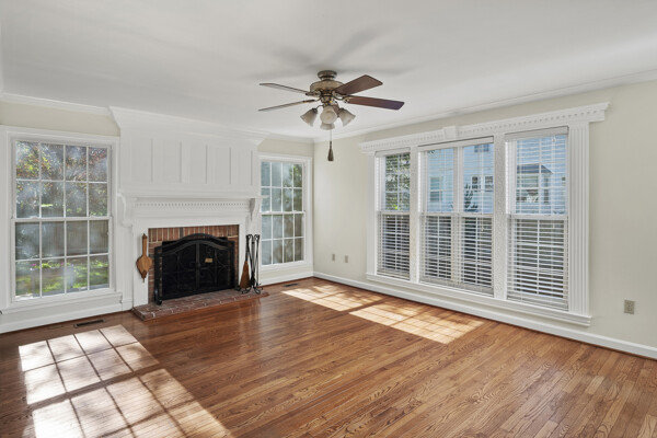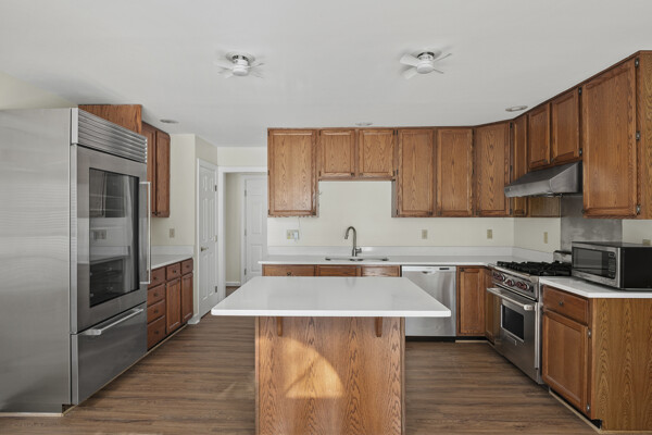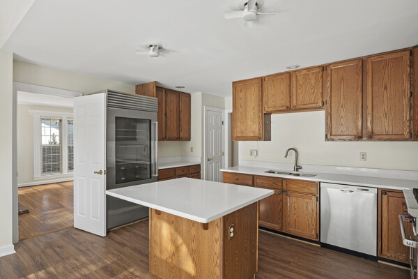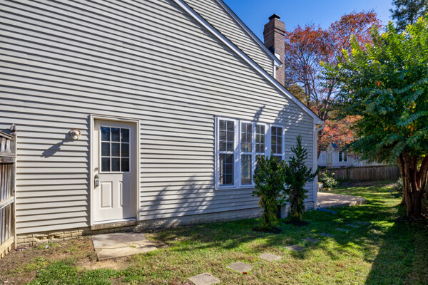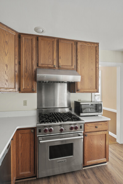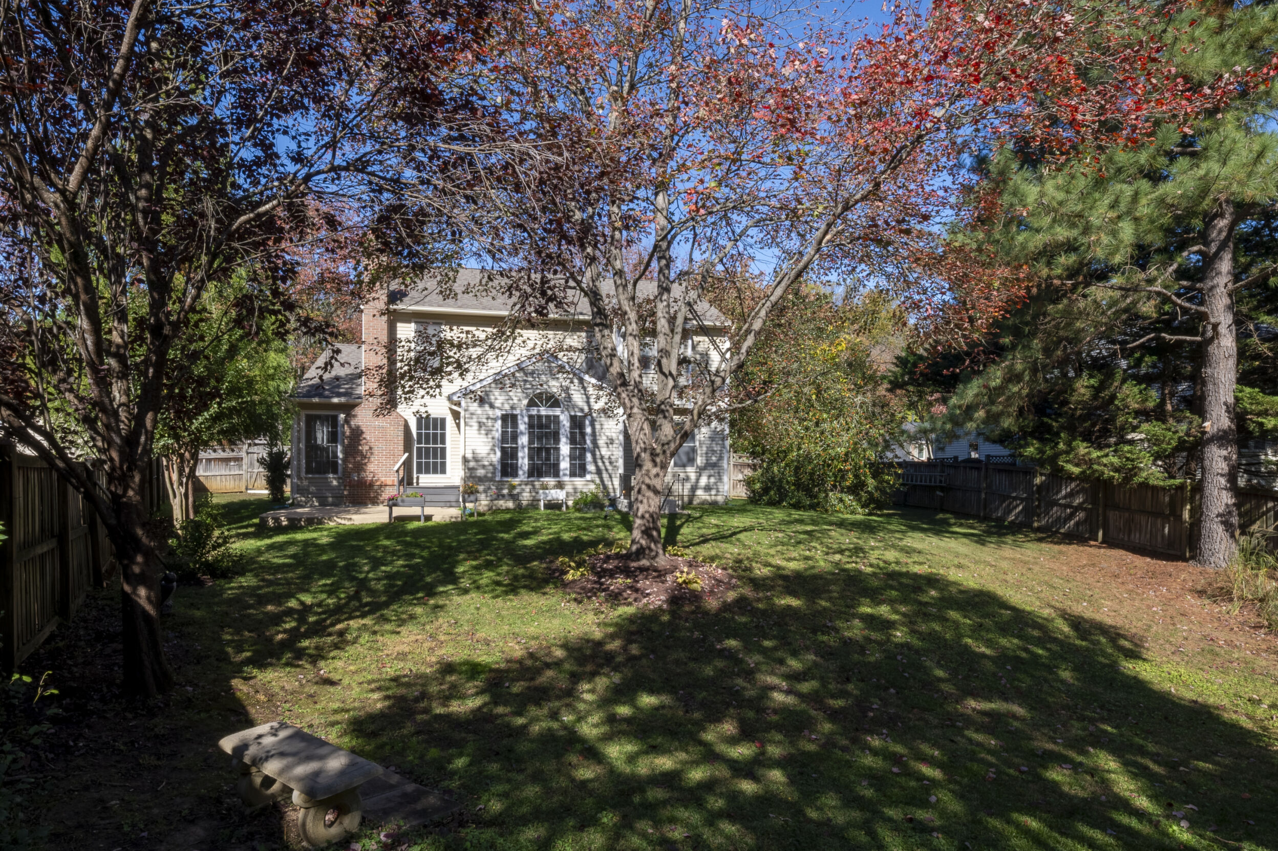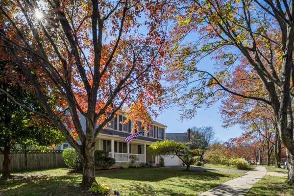 This beautiful colonial home welcomes you with timeless charm and a covered front porch overlooking the manicured yard. Step inside to a bright two-story foyer that opens to the living and dining rooms, both filled with natural light. The dining room features a lovely bay window and warm-toned wood flooring that continues throughout the main level. The kitchen is a true standout, offering a cheerful breakfast area with Palladian windows overlooking the fenced backyard and mature trees. Top-of-the-line stainless steel appliances include a Sub-Zero refrigerator with glass front, Bosch dishwasher, and Wolf stove—perfect for anyone who loves to cook. The inviting family room features a cozy fireplace and more sun-filled windows. Upstairs are four spacious bedrooms, all freshly carpeted and offering generous closet space. The primary suite includes a walk-in closet and ensuite bath with soaking tub and separate shower. The large lower level is unfinished but already framed and ready for your finishing touches.