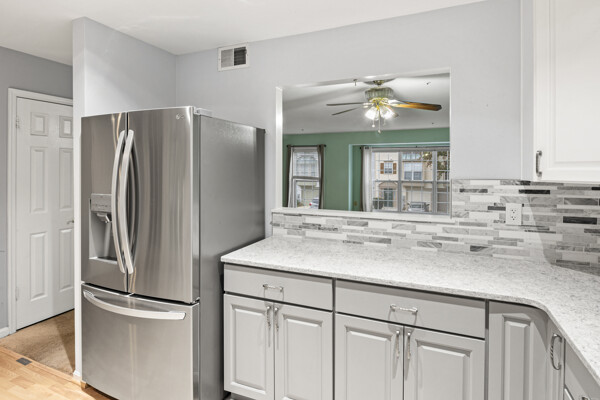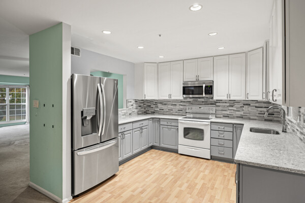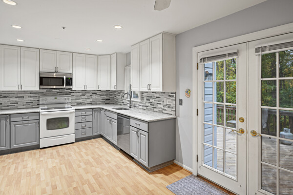Welcome to this spacious townhouse in the desirable Walden community, offering over 2,000 square feet of living space across three well-designed levels. The showstopper of this home is the kitchen, featuring beautiful quartz countertops in hues of gray and white that perfectly complement the glass tile backsplash with tones of black, gray, and white. The stylish ombré cabinetry (gray cabinets on the bottom and white cabinets on top) creates a contemporary, inviting feel; and the large pantry provides plenty of storage space for all your kitchen essentials.