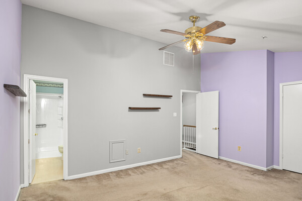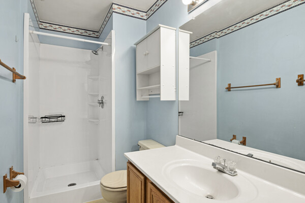 The upper-level features three bedrooms, including a primary suite with an ensuite bathroom and walk-in shower, along with a hall bathroom with a tub-shower combo.