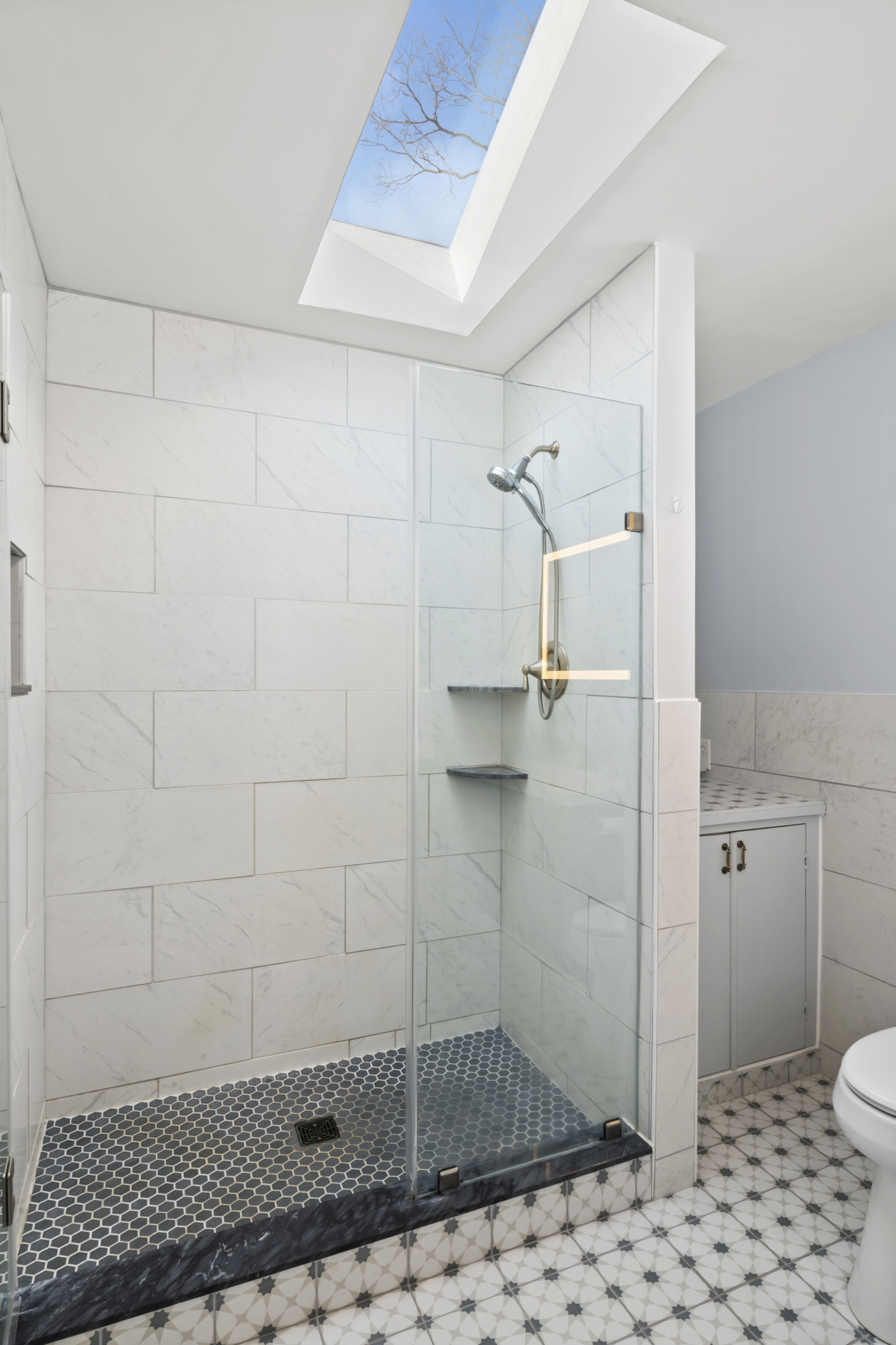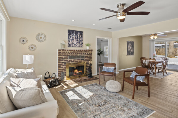 The open-concept living room is centered around a cozy wood-burning fireplace and flows into a spacious step-down family room, providing flexible space for relaxing, hosting, or creating a home office, gym, or media room. The owner’s suite includes a large remodeled en-suite bathroom addition with custom tile and a modern light-up mirror.