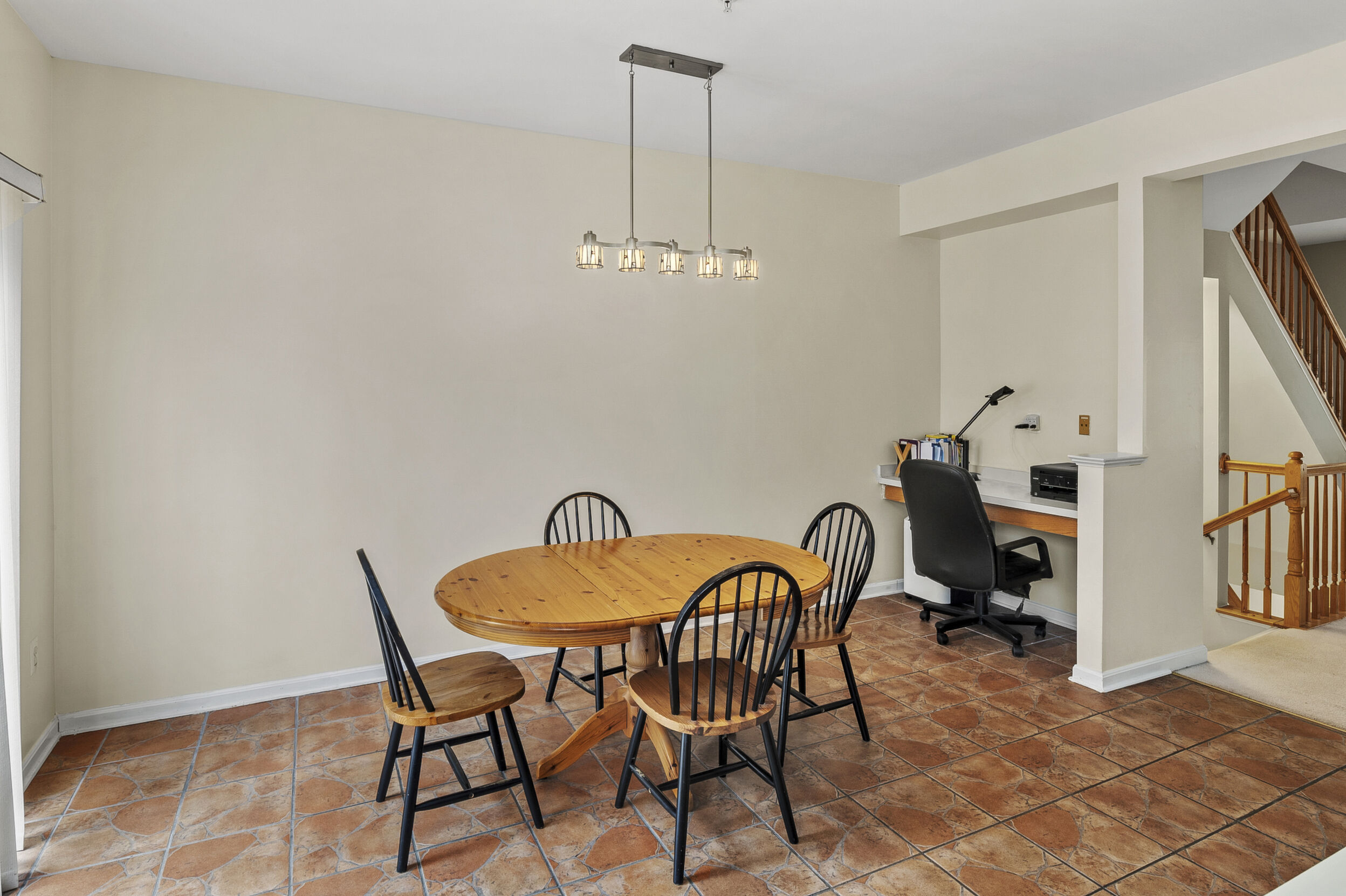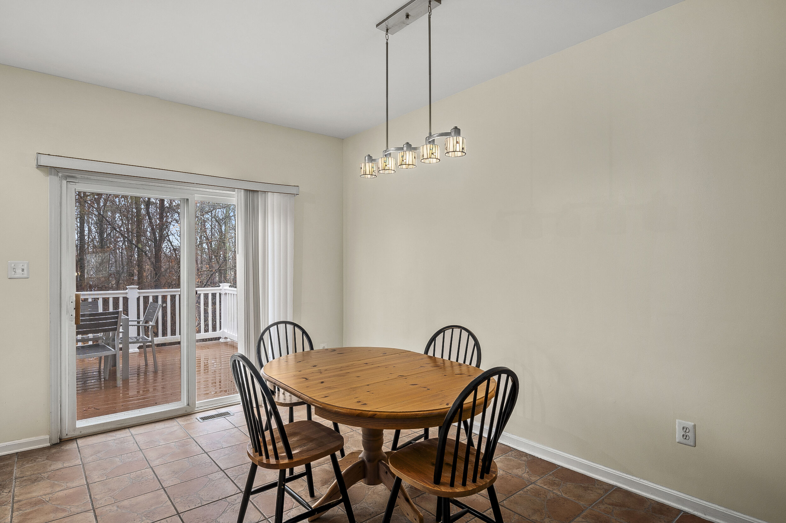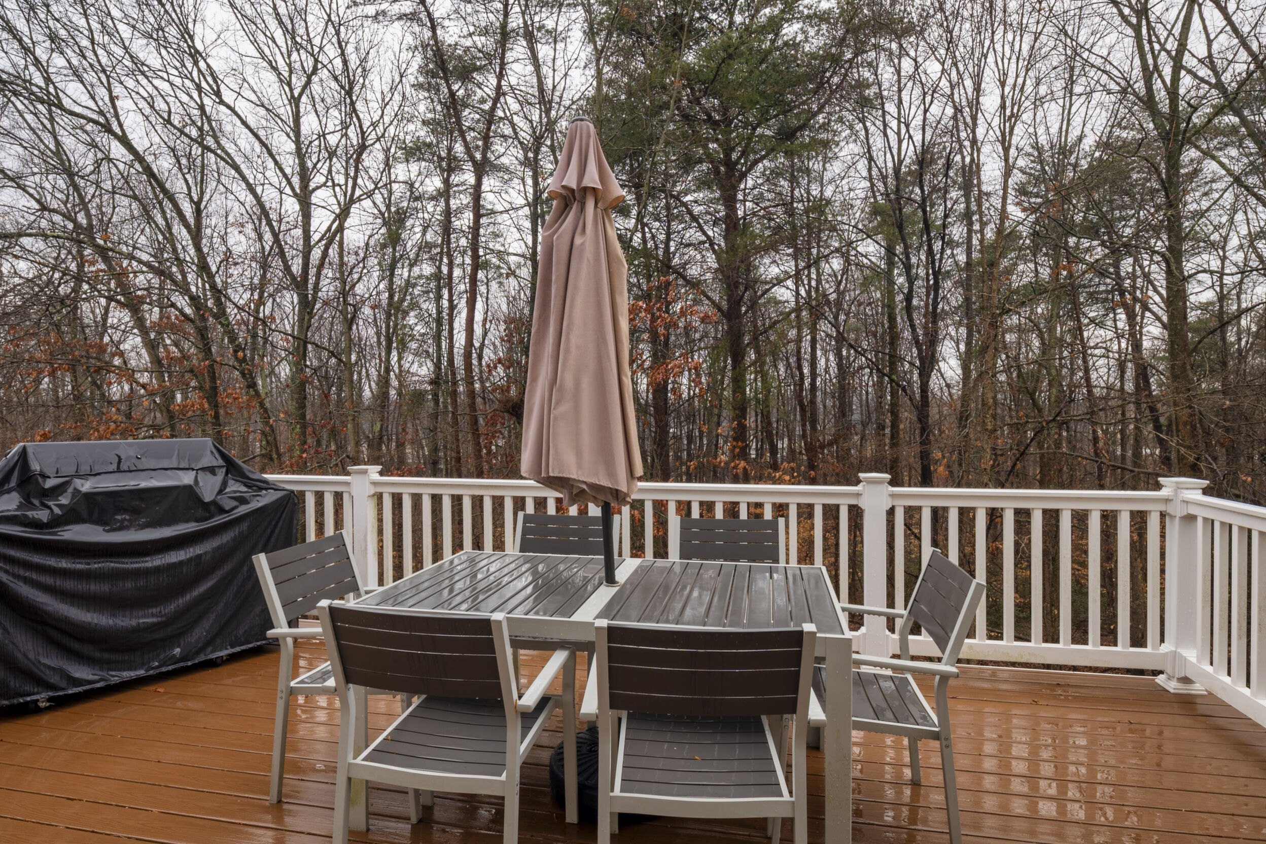 The main level features a large kitchen with dining space, updated appliances, and a spacious center island. Just off the kitchen is a beautiful deck overlooking the wooded backdrop, perfect for entertaining or relaxing. This level also includes a family room and dining area separated by a cozy gas fireplace, along with an additional half bath.