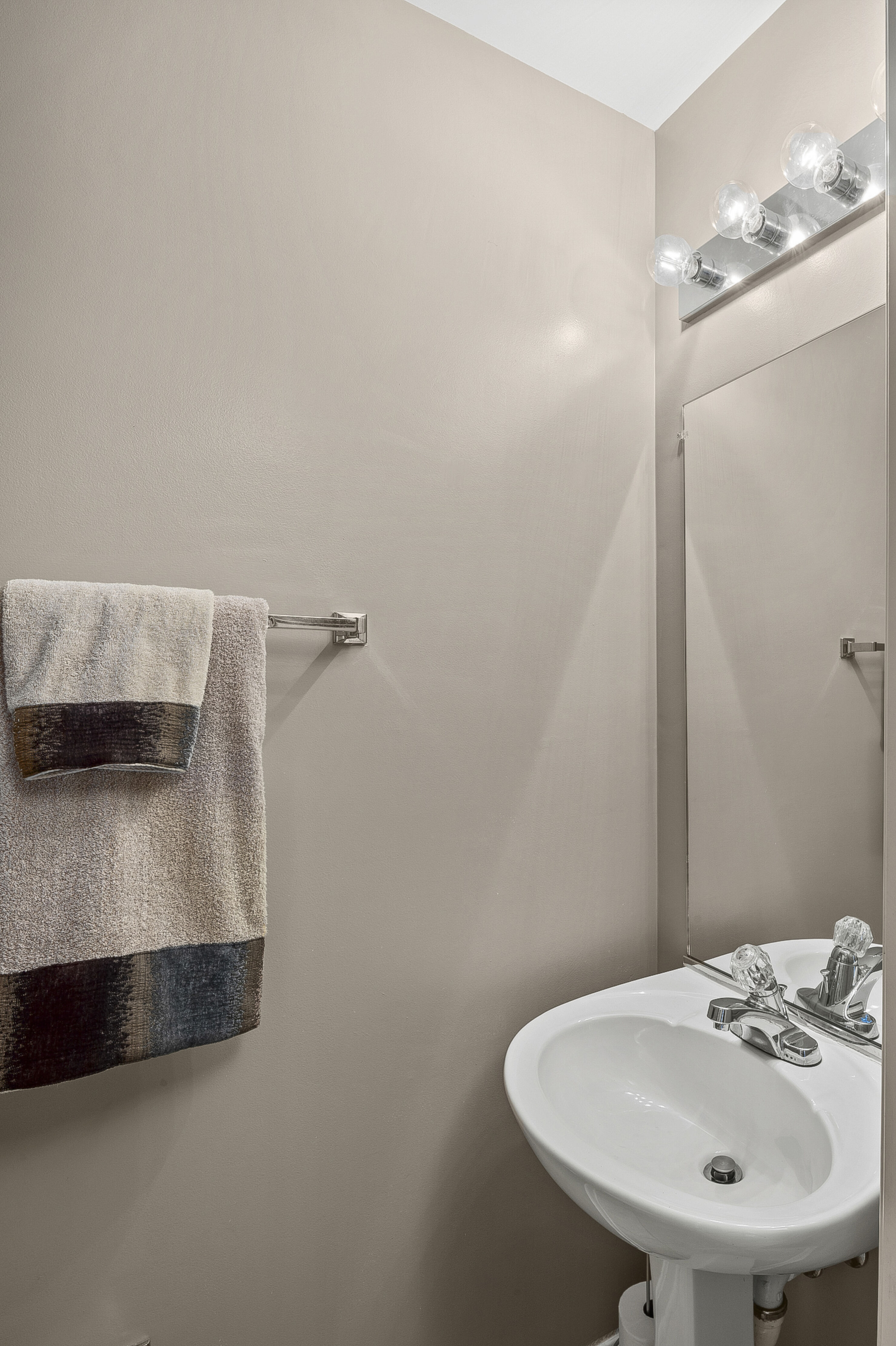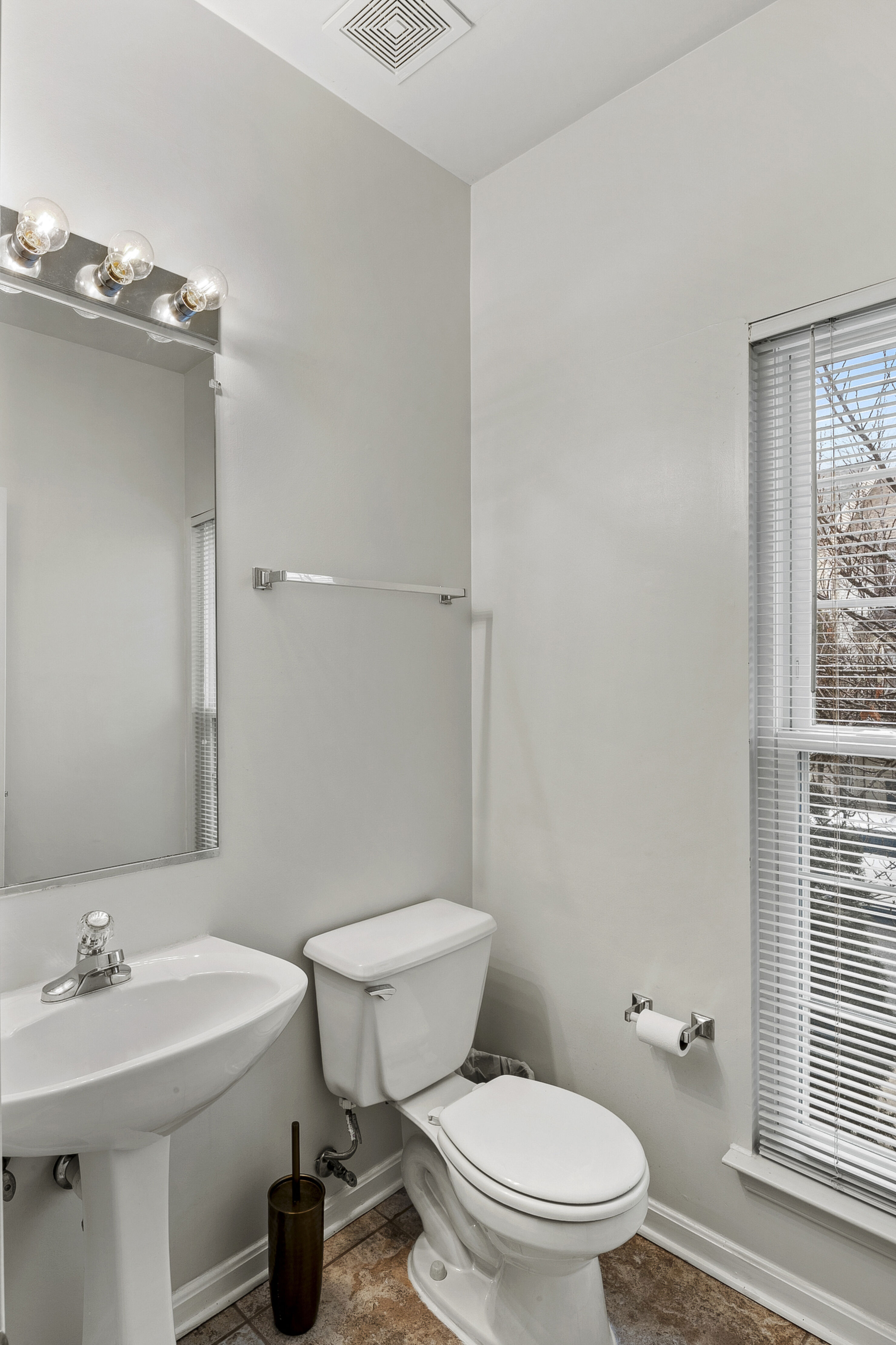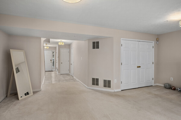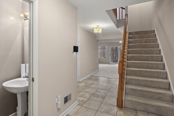 Upon entry, you’re welcomed by a tiled foyer with garage access, a spacious family room, and a convenient half bath. Step outside to the brick paver patio and enjoy peaceful views of the woods.