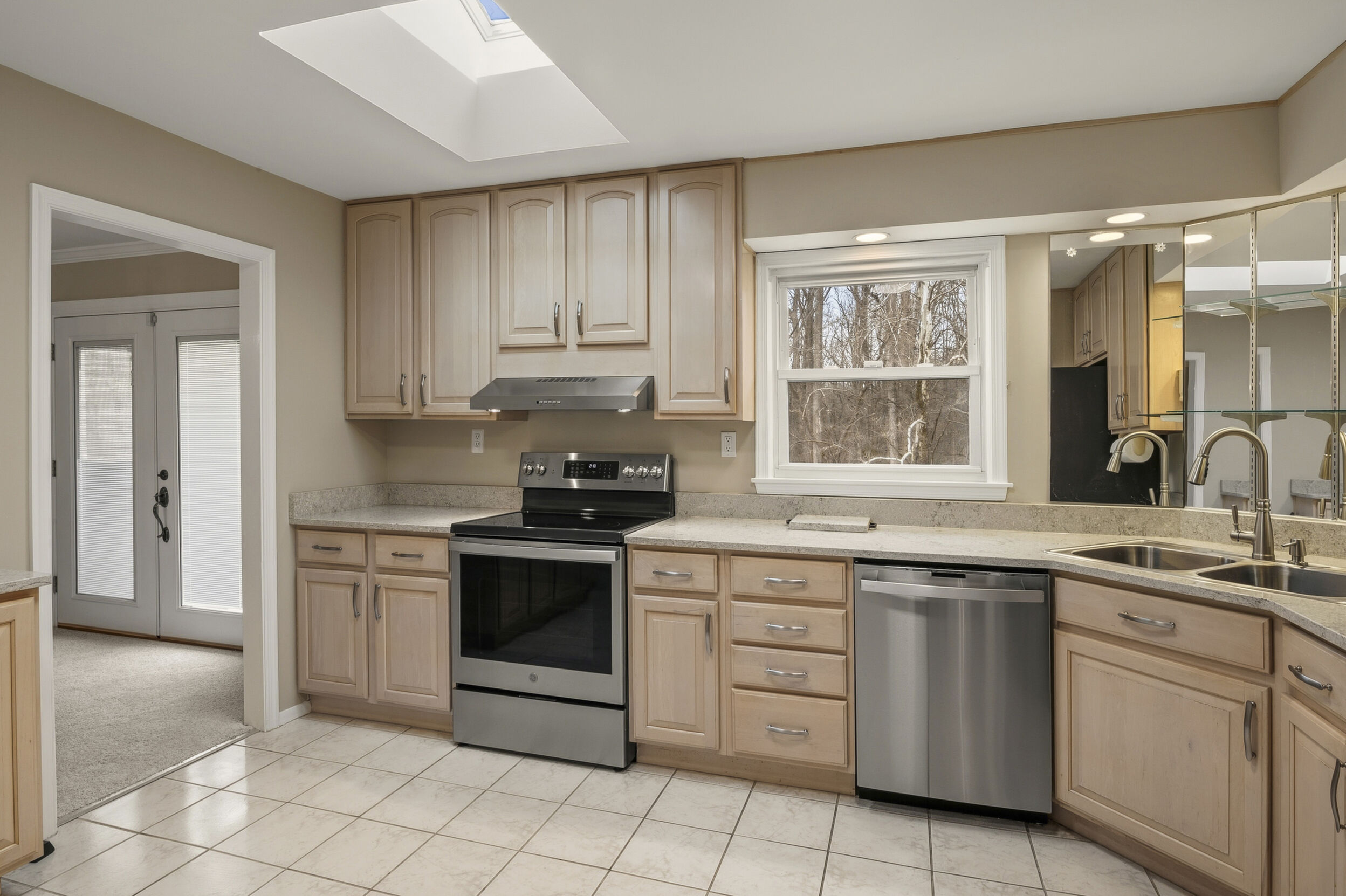 Beautiful home in sought after Calverton subdivision. Home has been very well cared for and features new carpet and refinished hardwoods. Main level boasts an updated kitchen with stainless steel appliances, granite countertops and skylight, spacious living and dining areas and door leading to patio and large yard (.49 acres) backing to mature trees and creek. Upper level has 3 bedrooms and 2 full baths; lower level has large family room with slider leading to backyard; fireplace and built-in shelving, half bath, and large utility room for storage and laundry with outdoor side exit. There is a one car garage with attic access and opener.